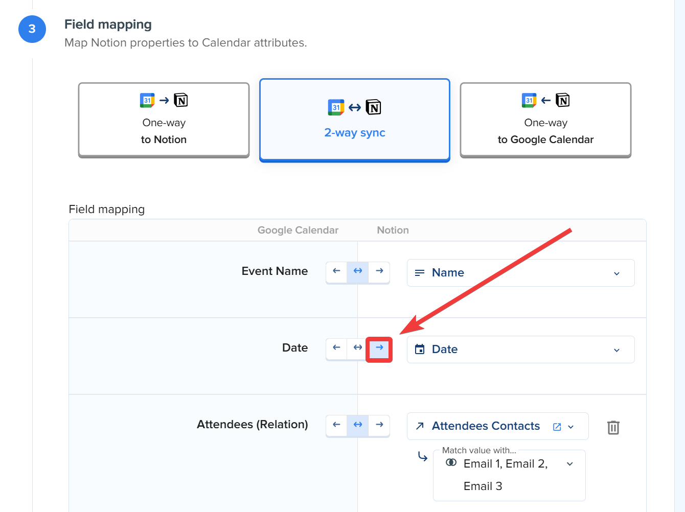 Si vous configurez une synchronisation bidirectionnelle, vous pouvez choisir quels champs sont synchronisés dans une seule direction. Vous pouvez le faire dans la section Mappage des champs en regardant les flèches à côté de chaque champ.